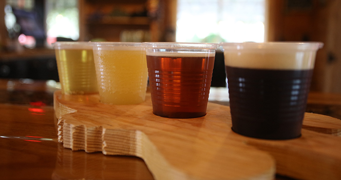We order a tasting flight, which comes served on a wooden plank shaped like a fish, and he sets us up with the following: Shellcracker Cream Ale, Sea Breeze Sour, Wood Duck Wheat, and Chill Out Greg, a pale ale he tells us is named after him.